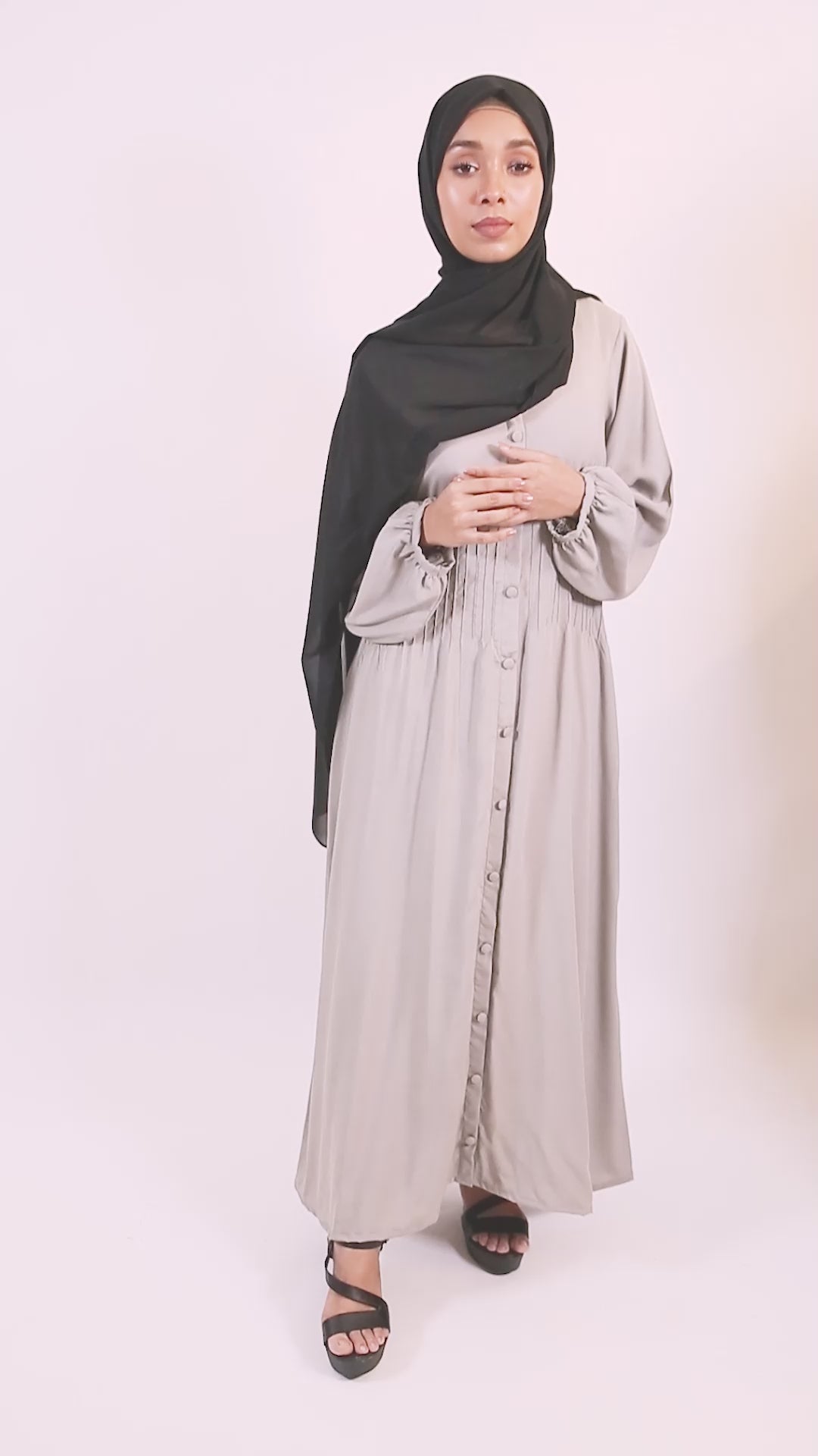 A linen modest maxi dress in a serene and elegant smoke gray color, featuring a pleated waist and a row of top-to-bottom front buttons, is a vision of effortless grace and timeless style.