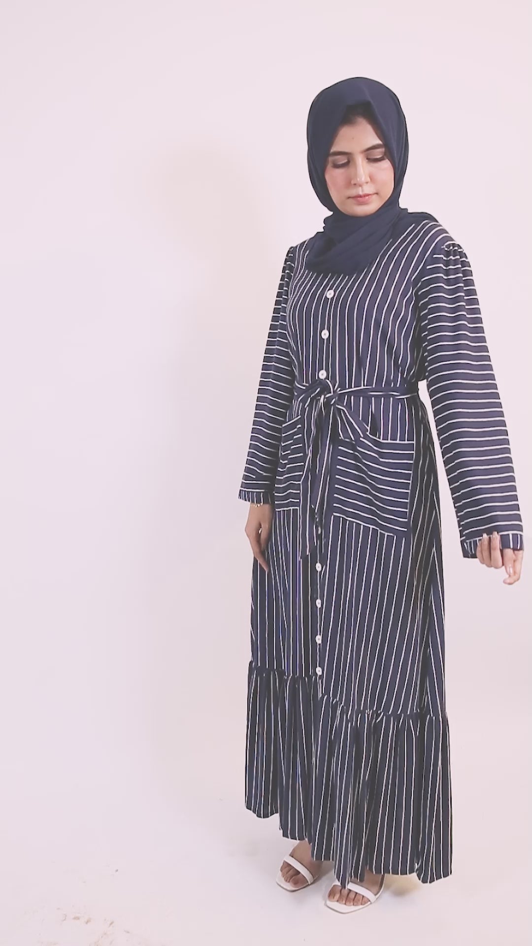Introducing the 'Mahit,' a chic linen maxi dress that effortlessly combines sophistication and practicality. This elegant dress, in a classic navy blue pinstripe, exudes timeless style. The 'Mahit' dress is not only a fashion statement but also a functional choice, as it features side pockets. These pockets not only add a touch of convenience for carrying essentials but also blend seamlessly with the overall design. Elevate your style with this elegant and versatile linen dress in a timeless navy blue hue, featuring delicate pinstripes that add a touch of sophistication. This modest yet fashionable dress is designed to provide both comfort and style, making it a perfect choice for any occasion.